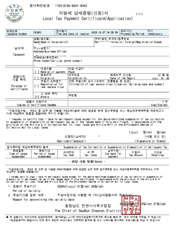 지방세완납증명서 유효기간은 증명서 발급일로 부터 30일입니다.