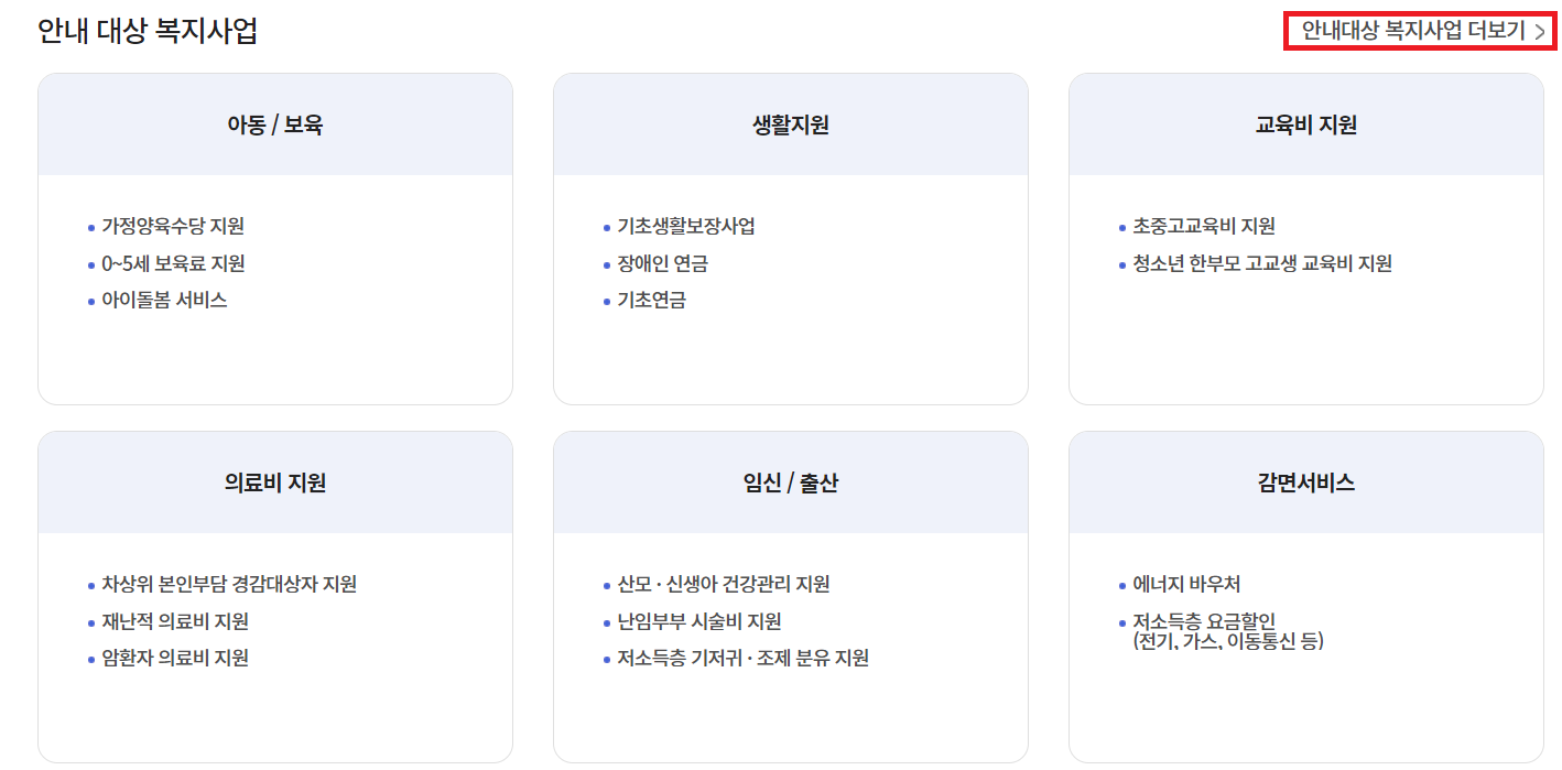 사업별 자세한 내용을 보고 싶은 경우에는 안내대상 복지사업 더 보기를 통해 확인해 볼 수 있습니다.