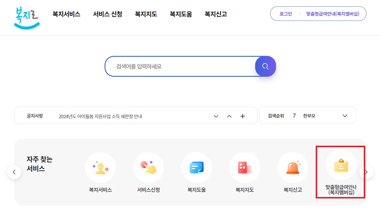 복지로 누리집 접속 → 복지로 로그인 → 맞춤형 급여안내(복지멤버십)