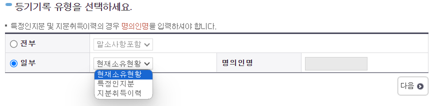 √ 등기사항 유형을 선택한 후 다음을 클릭합니다.