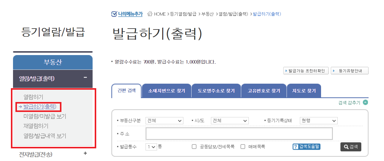 열람 수수료는 700원, 발급 수수료는 1,000원입니다.