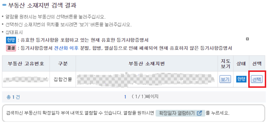 √ 간편 조회를 통해 집합건물(아파트)에 대해서 검색결과가 나오면, 선택을 클릭합니다.