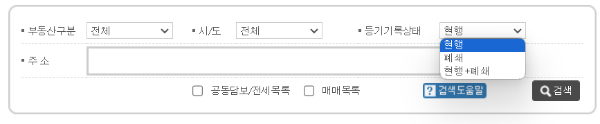 등기기록상태는 현행, 폐쇄, 현행 + 폐쇄 중 하나를 선택하신 후 발급받으실 수 있습니다.