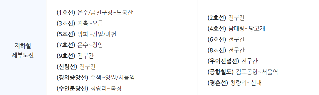 신분당선, 서울지역 외 광역전철, 광역·공항 ·시외버스, 타 지역 면허 버스, 택시는