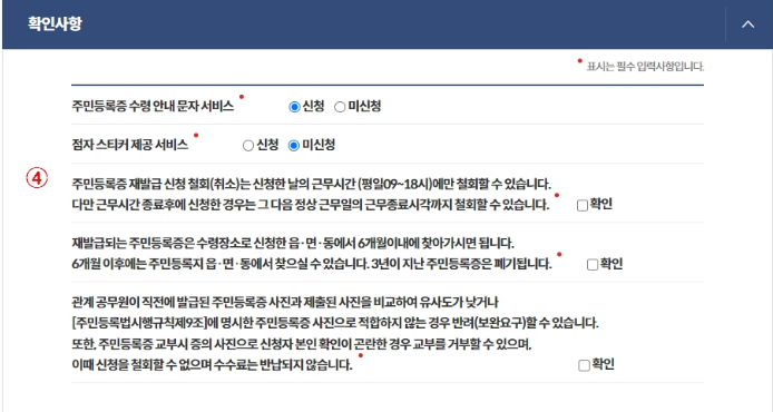 ④ 확인 사항을 읽은 후 체크 (수령 안내 메시지 서비스 미신청 가능)