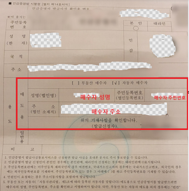 매도용 인감증명서를 발급받기 전에 매수자 인적사항(성명, 주민등록번호, 주소)을