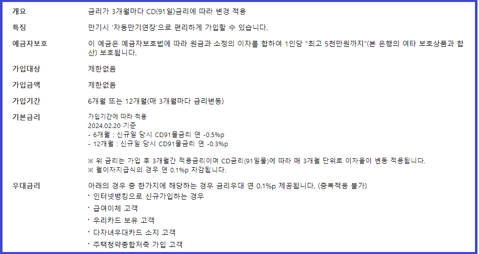 지금까지 우리은행 정기예금 종류에 대해서 말씀드렸습니다.