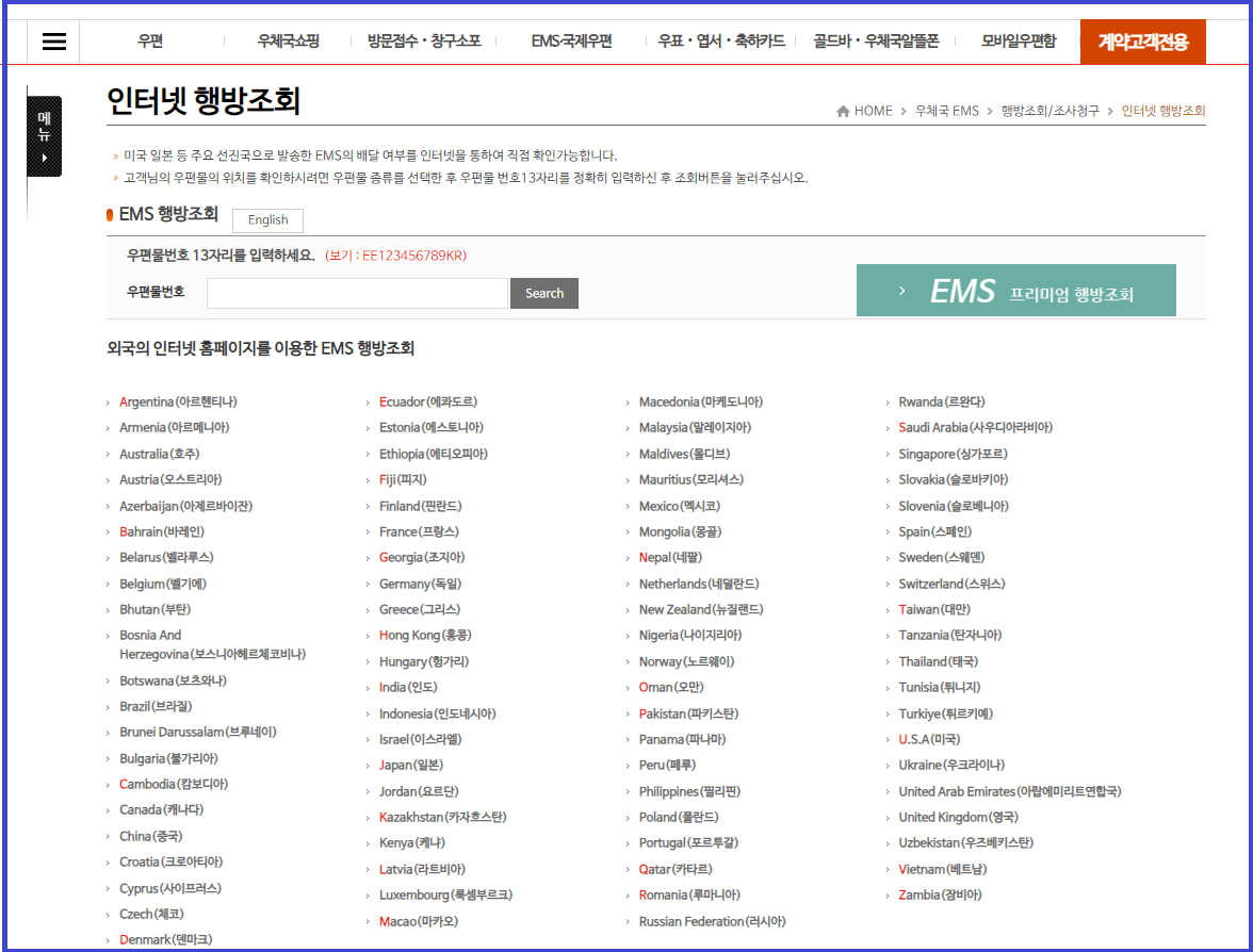 외국의 인터넷 홈페이지를 이용한 EMS 행방조회도 할 수 있습니다.