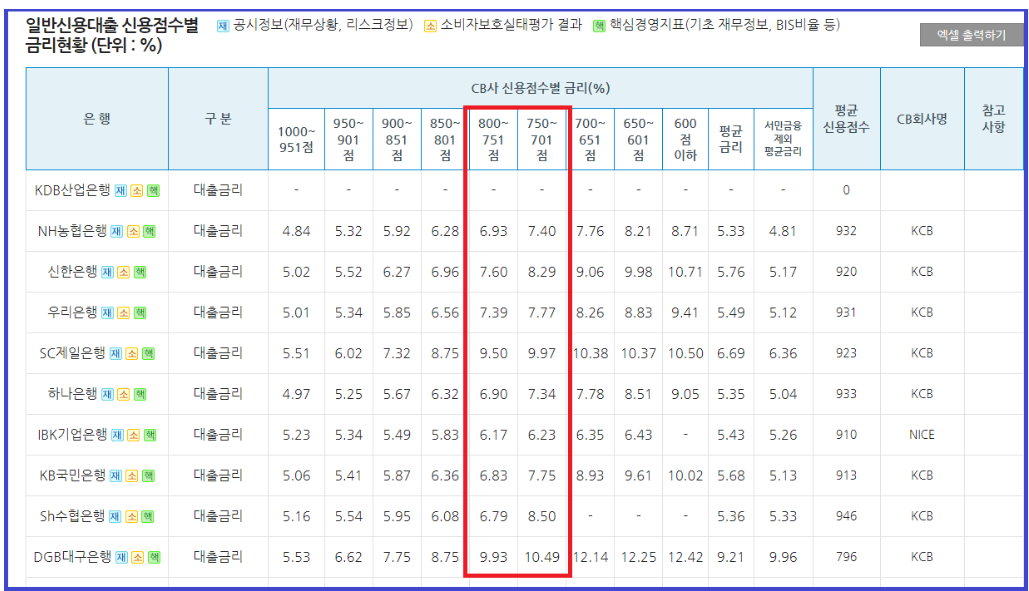 아래 표도 보시면, 신용점수별 대출 금리를 확인해 보시면, 신용이 낮을수록 대출금리가