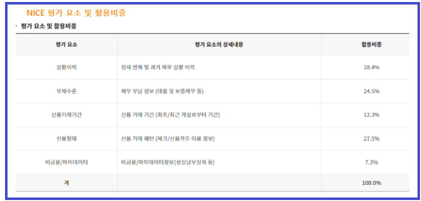 NICE는 과다채무, 연체, 상환 이력 등을 주요하게 보고 평가하고 있습니다.
