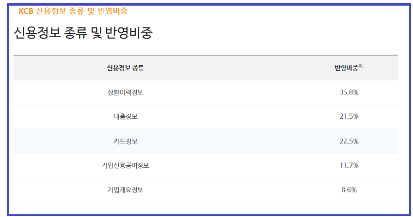 √ KCB 신용정보 종류 및 반영비중은 다음과 같습니다.