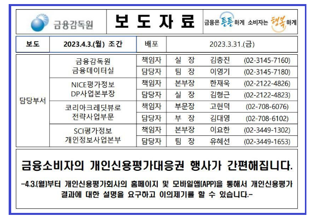 2023년 4월 3일부터 개인 신용점수에 이의가 있는 경우 신용평가회사의 홈페이지 또는