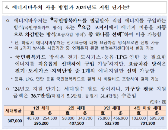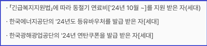 | 동절기 바우처 | 요금차감 | 2024. 10. 01 ~ 2025. 5. 25 | 전기 ·도시가스 ·지역난방 중 택1 |