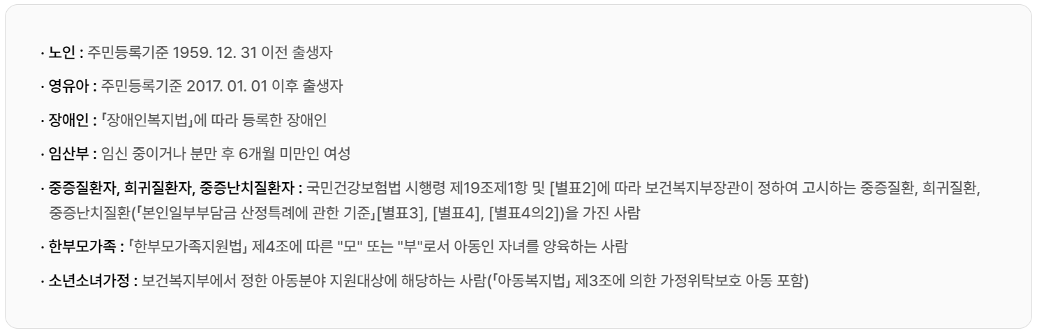 수급자 또는 세대원이 65세 이상 노인, 7세 이하 영유아, 장애인, 임산부, 중증·희귀·
