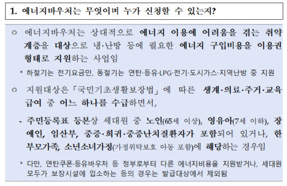 에너지바우처는 상대적으로 에너지 이용에 어려움을 겪는 취약계층을 대상으로