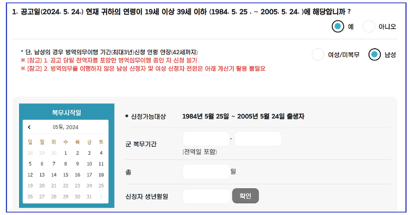 - 1984. 5. 25 ~ 2005. 5. 24 출생자 (※ 가구당 1명 가능합니다.)