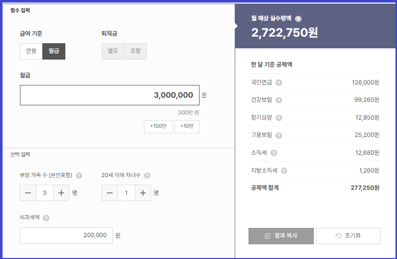 월급이 3백만 원이고 부양가족수가 본인포함 3명 (20세 이하 자녀수 1명 포함)으로