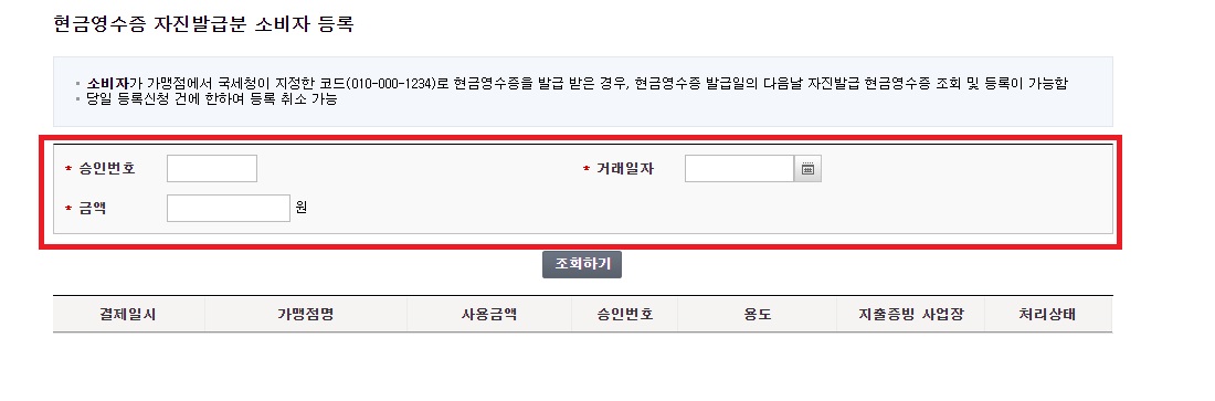 ③ 현금영수증 자진발급분 소비자 등록에서 승인번호, 거래일자, 금액을 입력하시면 됩니다.