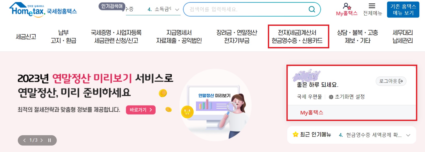 ① 국세청 홈페이지에 로그인하신 후, 전자(세금) 계산서 현금영수증·신용카드를 클릭합니다.
