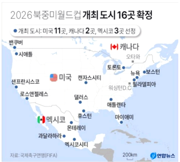 2026 월드컵은 미국이 대부분의 경기를 유치하며 캐나다와 멕시코가 일부 경기를 분산 유치하는 형식에